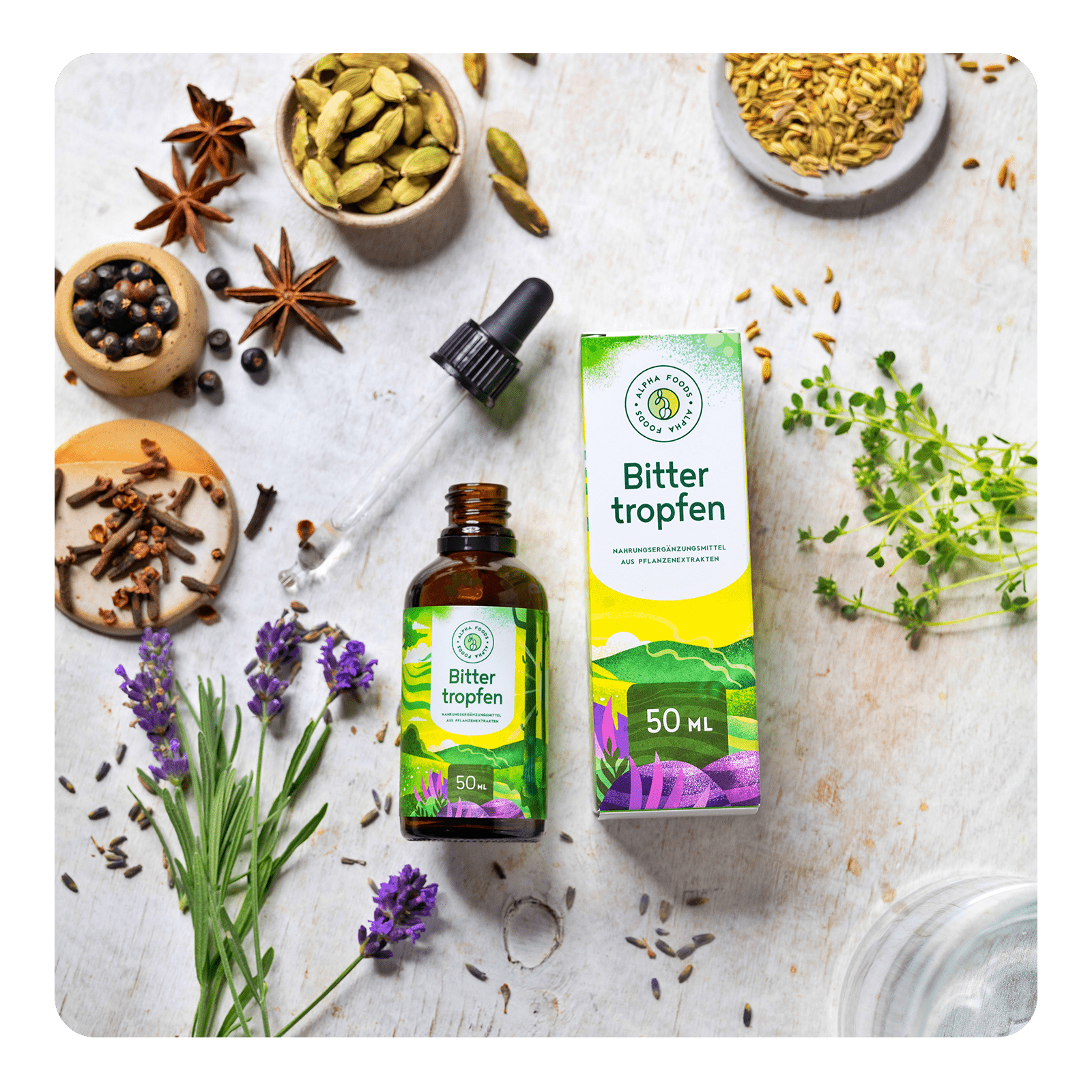 Our bitter drops consist solely of herbs distilled with alcohol. We often work with a modern water extraction process - but water- and (!) fat-soluble active secondary and bitter substances can only be processed in water, which is why these drops are deliberately not alcohol-free.