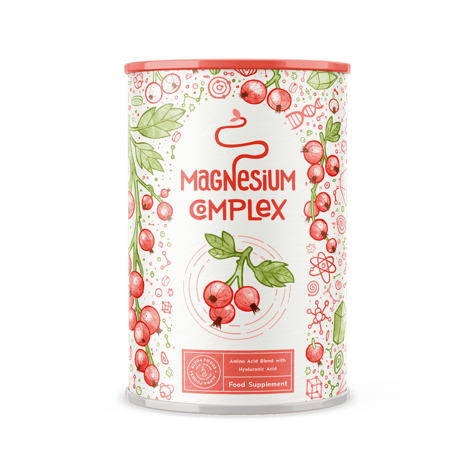 Alpha Foods Magnesium Complex is a symbiotic formula of magnesium salts of citric acid, magnesium malate, magnesium salts of orthophosphoric acid, magnesium gluconate, magnesium bisglycinate and magnesium L-ascorbate. One serving is 4.8g powder (=1 scoop) of which 360 are elemental and cellular available magnesium, which corresponds to 96% of the recommended daily intake.