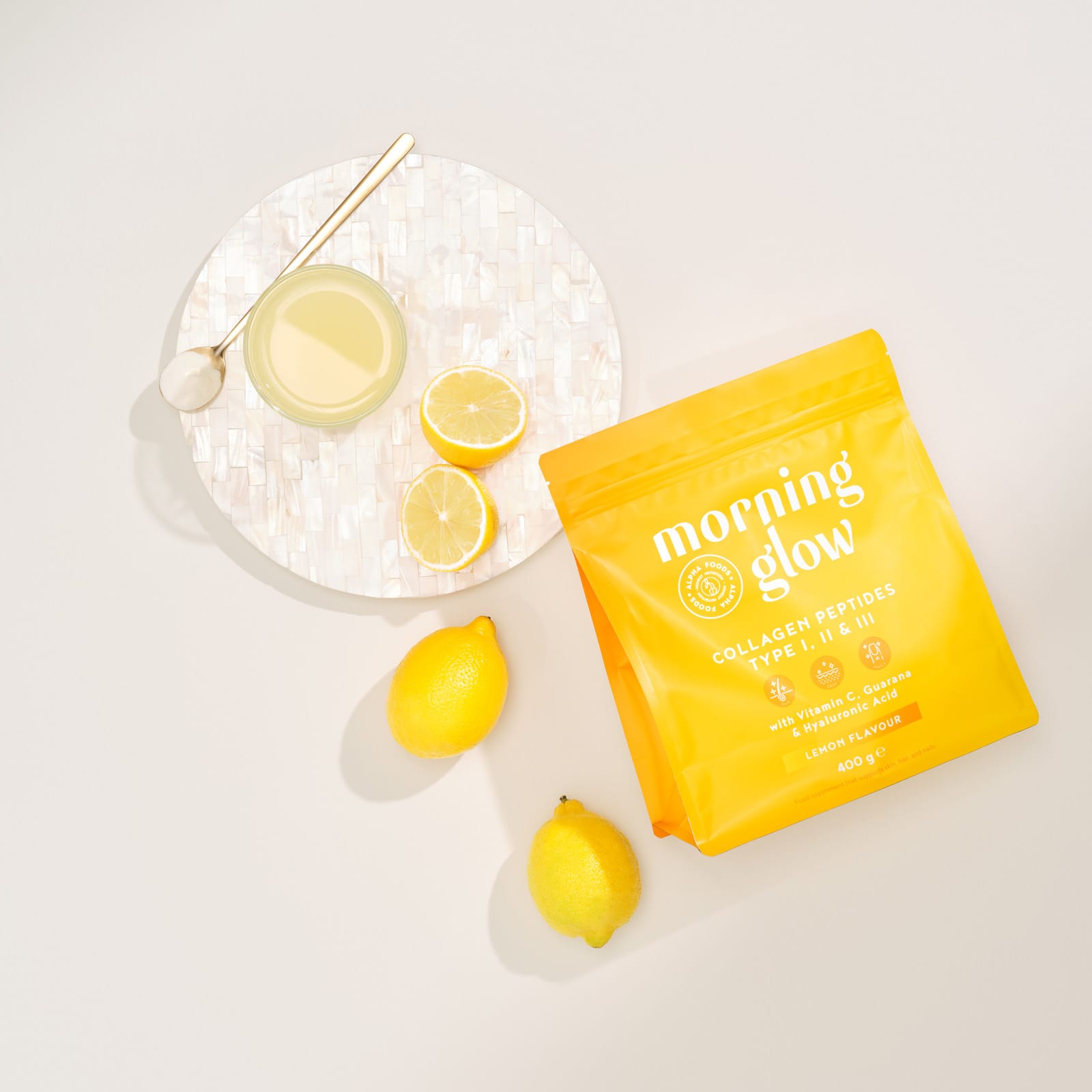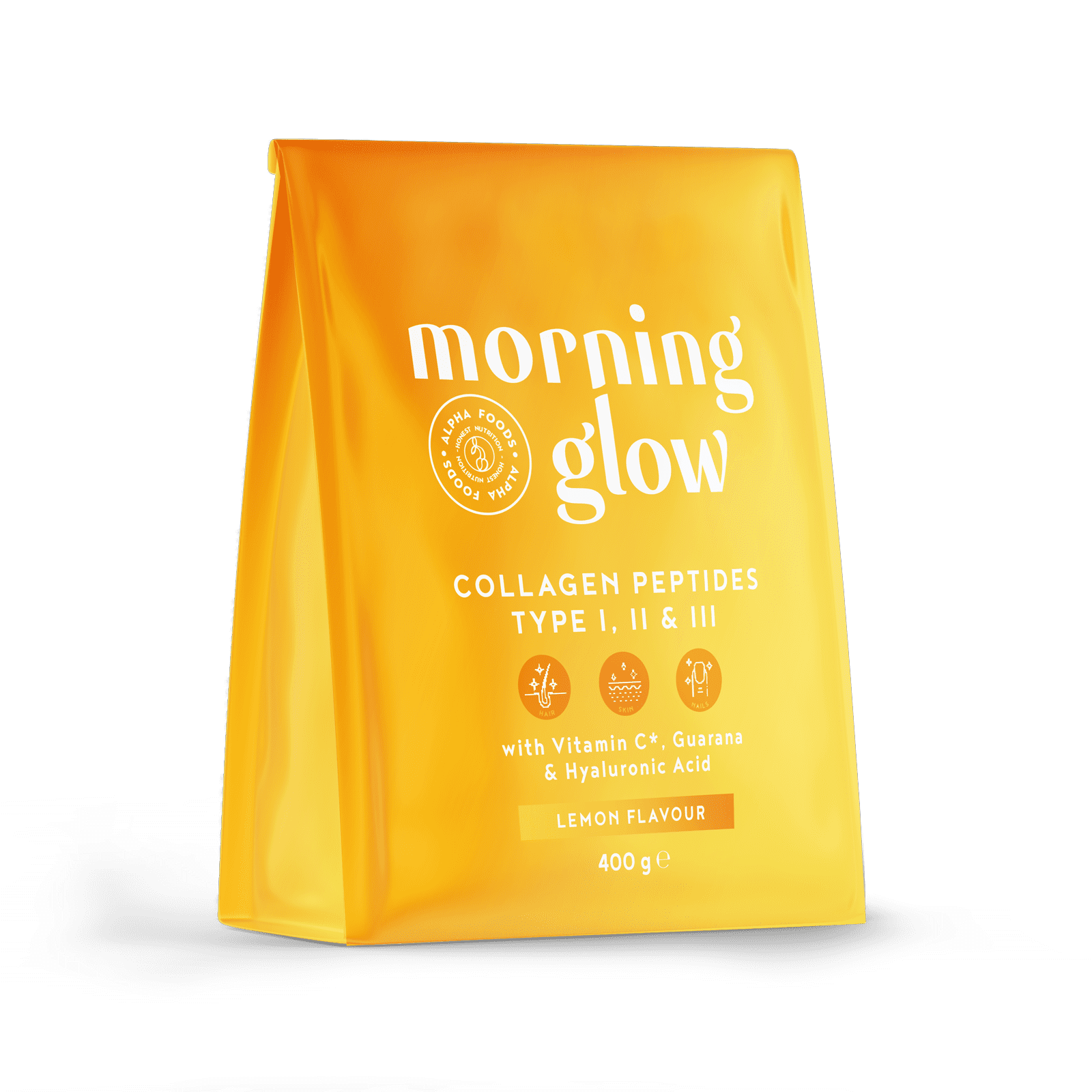 Morning Glow Collagen is a collagen drink, specifically created for your daily self-care routine in the mornings. Featuring a comprehensive blend of collagen, vitamins C and E and hyaluronic acid, it’s sure to become an unmissable step in your daily morning routine for healthy skin, hair and nails*. Not only does it have vast nutritional value, but thanks to its guarana seed extract, it also gives you an energy boost* exactly when you need it most. With a natural lemon flavour from real lemon juice, it’s a refreshing way to start every morning—caring for yourself and helping you put your best face forward.